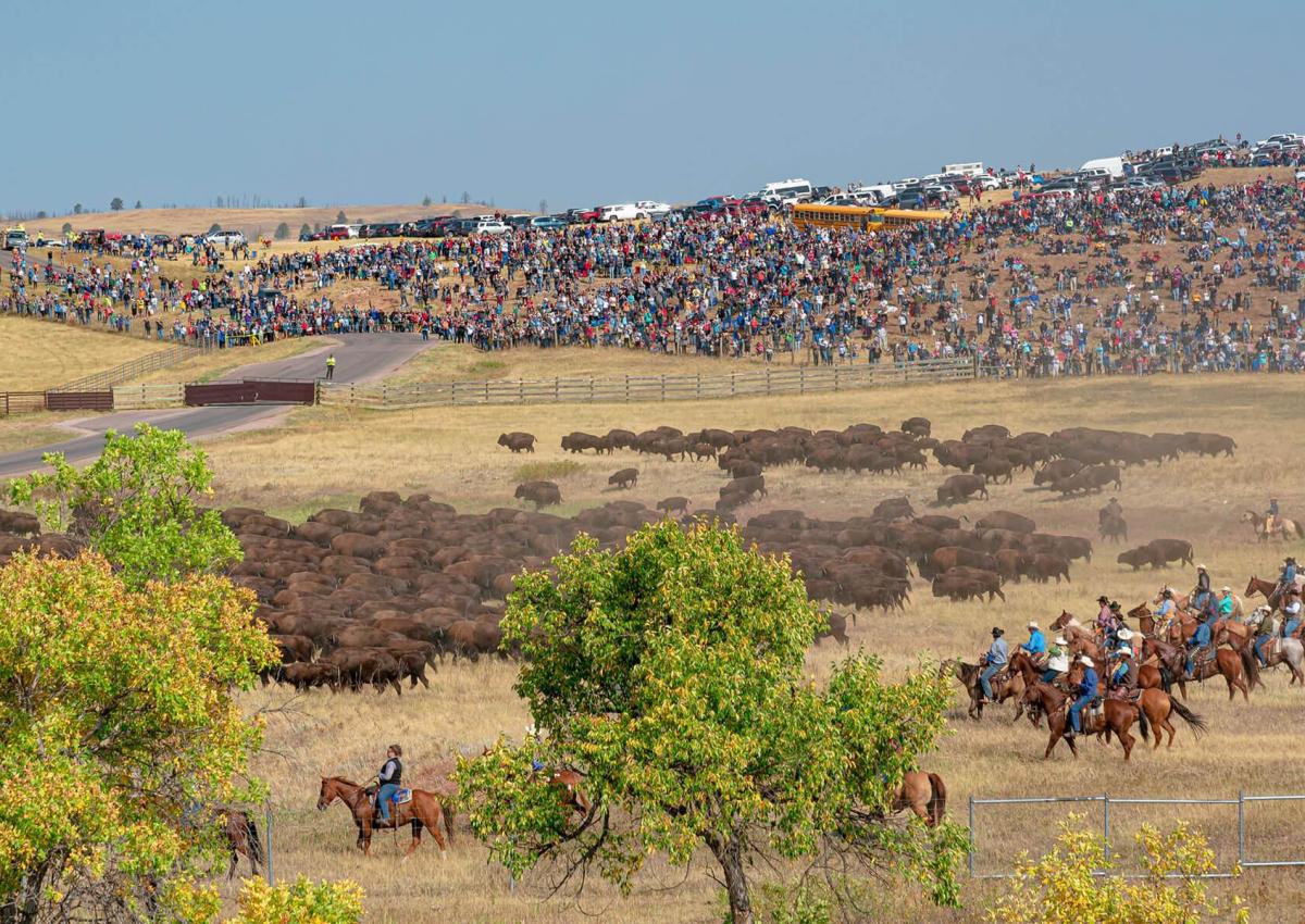 Every September the buffalo in Custer State Park are rounded up for herd management purposes. The average size of the herd is 1,300 buffalo that are sorted through corrals and branded. Afterward each buffalo’s health is checked and they are treated.